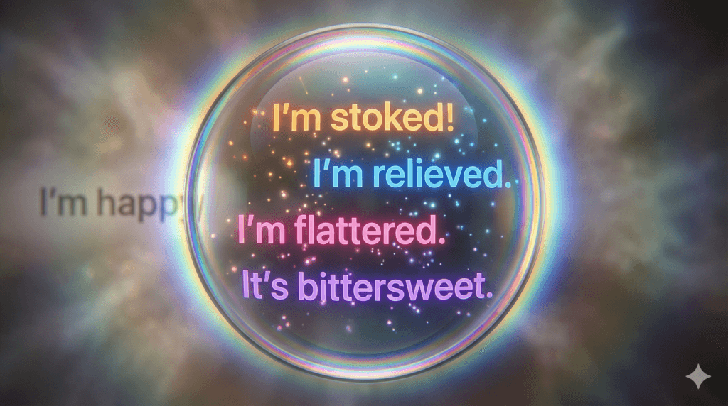 しかし、私たちの感情はもっと複雑で、グラデーションに富んでいるはずです。例えば「嬉しい」の中にも、飛び跳ねたいほどの興奮もあれば、ホッとした安堵の気持ち、あるいは誰かに褒められて誇らしい気持ちもあります。この感情の「解像度」を上げることこそが、一歩進んだボキャブラリー習得の鍵となります。